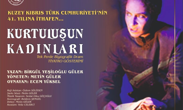 Kültür Dairesi organizasyonu ile Türkiye’den KKTC’ye taşınan oyun, 28 Kasım Perşembe akşamı, saat 19.00’da, Atatürk Kültür Merkezi’nde ücretsiz olarak sahnelenecek. Birgül Yeşiloğlu Güler’in yazdığı ve Tiyatro Sanatçısı Ecem Yüksel’in oynadığı Kurtuluş Savaşı’nın kahraman kadınlarını anlatan tek perdelik biyografik dramı Metin Güler yönetiyor.