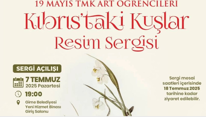 19 Mayıs TMK Art öğrencileri tarafından hazırlanan ‘Kıbrıs’taki Kuşlar’ temalı resim sergisi, sanatseverlerle buluşmaya hazırlanıyor. Girne Belediyesi’nin katkılarıyla ve VGP Foundation, NABU International ile ÇADER’in iş birliğinde düzenlenen serginin açılışı, 7 Temmuz 2025 Pazartesi günü saat 19.00’da, Girne Belediyesi Yeni Hizmet Binası Giriş Salonu’nda gerçekleşecek.