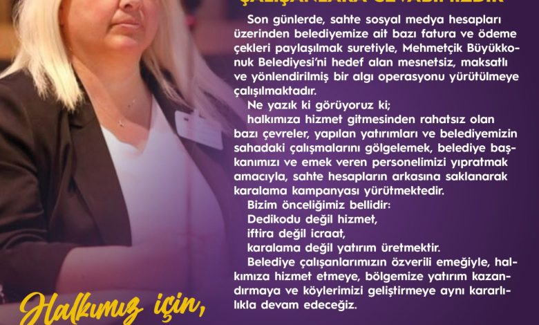 Mehmetçik Büyükkonuk Belediyesi, son günlerde sosyal medyada sahte hesaplar üzerinden paylaşılan fatura ve ödeme belgeleriyle ilgili kamuoyuna yazılı açıklama yaptı. Açıklamada, söz konusu paylaşımların gerçeği yansıtmadığı ve belediyeyi hedef alan bir algı operasyonu niteliği taşıdığı belirtildi.